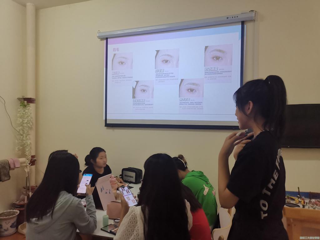 本次素质拓展活动由社交与礼仪协会会长房双双进行讲解。活动开始,学生干部房双双通过PPT的播放和讲解图文结合地向大家展示,如何根据自己的五官特征取长补短,从而做到有效化妆,并耐心的回答同学们对于如何在不同阶段更好的展示自己以及化妆技巧方面的各种疑问,讲解人向他们介绍不同肤质应当如何选择适合自己的化妆品等等。对于较有难度的化妆步骤,讲解人也在一定程度上给予指导,根据同学们自带的化妆品、化妆刷、化妆镜子等工具,帮助她们完成妆面。讲座接近尾声,讲解人也向大家可以使妆面更加精致的小技巧,比如适当的点痣等内容。