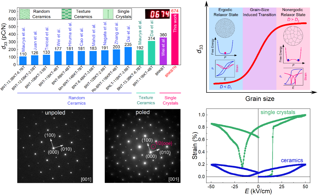 近日,我校魏永星副教授研究团队硕士研究生关畅澎在国际顶级学术期刊《Acta Materialia》(IF=9.3)上发表了题为“High piezoelectric performance and ergodic-nonergodic relaxor transition induced by single crystallization in Bi0.5Na0.5TiO3-based materials”的学术论文。太阳成集团tyc1286为第一通讯单位,魏永星副教授为通讯作者,西安交通大学靳立教授为共同通讯作者。