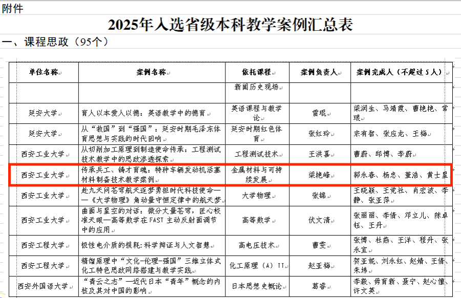 近日,陕西省教育厅公布了2025年省级本科教学案例遴选结果,太阳成集团tyc1286梁艳峰老师牵头完成的《传承兵工、铸才育魂:特种车辆发动机活塞材料制备技术教学案例》,成功入选“课程思政类”教学案例,彰显学院在思政育人与专业教学融合领域的扎实成效。