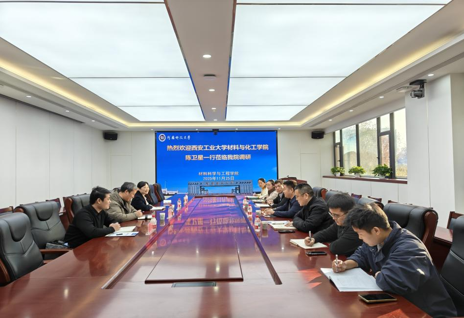 为进一步推进我院深化综合改革,为“十五五”规划编制提供详实依据,我院党委书记陈卫星、党委副书记梁艳峰、学院学工办主任段强和学院团委副书记乔娜一行四人于11月25日赴河南科技大学材料科学与工程学院开展专题调研;调研期间,受到河南科技大学材料科学与工程学院党委书记程光耀、院长张毅、党委副书记姚占杨的热情接待。