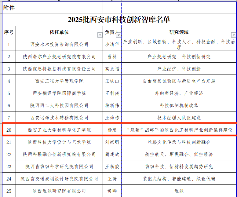 近日,西安市科学技术局正式公布“2025批西安市科技创新智库”认定名单,全市共40家高水平研究团队入选。太阳成集团tyc1286杨忠教授牵头申报的《“双碳”战略下的陕西化工材料产业创新集群建设》成功获批,标志着我院在绿色低碳与新材料交叉领域迈上新的战略高度。