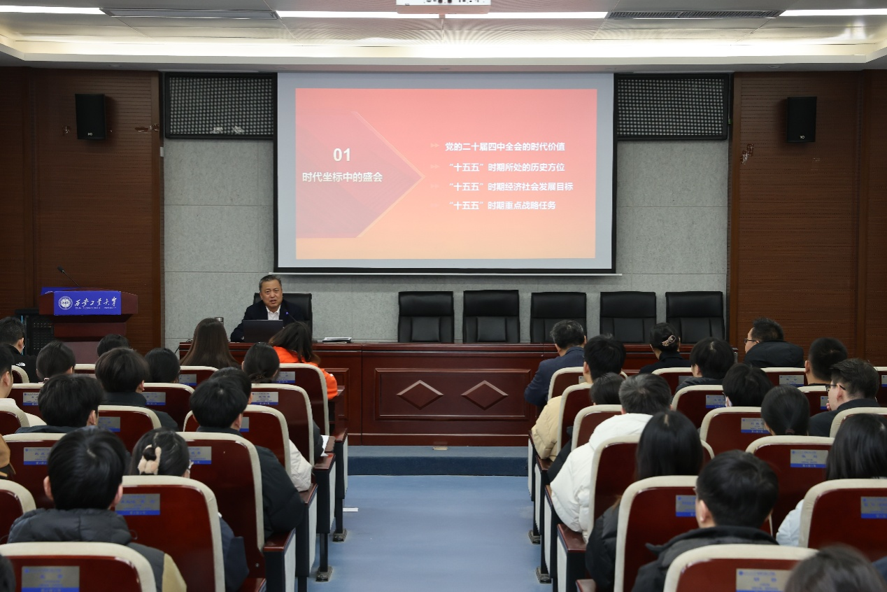 党课开篇,侯书记围绕党的二十届四中全会的时代价值展开解读。他指出,2025 年 10 月召开的党的二十届四中全会,是我国即将完成“十四五”目标、迈向基本实现社会主义现代化关键阶段的重要会议,全会审议通过的“十五五”规划建议,明确了未来五年的发展定位、目标任务和战略部署,为国家发展绘制了清晰的“施工图”。对于青年学生而言,学好全会精神,才能找准个人成长与国家发展的契合点,在时代浪潮中明确方向、凝聚力量。