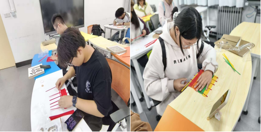 文化讲解结束后,手工创作环节正式开启。学院为同学们精心准备了竹编画手工材料包,其中包含竹篾、底板、胶水等工具,以及带有中秋“玉兔桂树”、国庆“红韵福字”等主题元素的创作模板。拿到材料包后,同学们迅速投入创作,通过疏密交织的编织手法,既体现了国庆的喜庆氛围,又传递了对家国的美好祝愿。创作过程中,同学们不时相互交流编织技巧,遇到难题时主动向身边同学请教,现场氛围热烈而融洽,每一根竹篾的穿梭,都凝聚着大家对传统文化的热爱与对双节的期待。