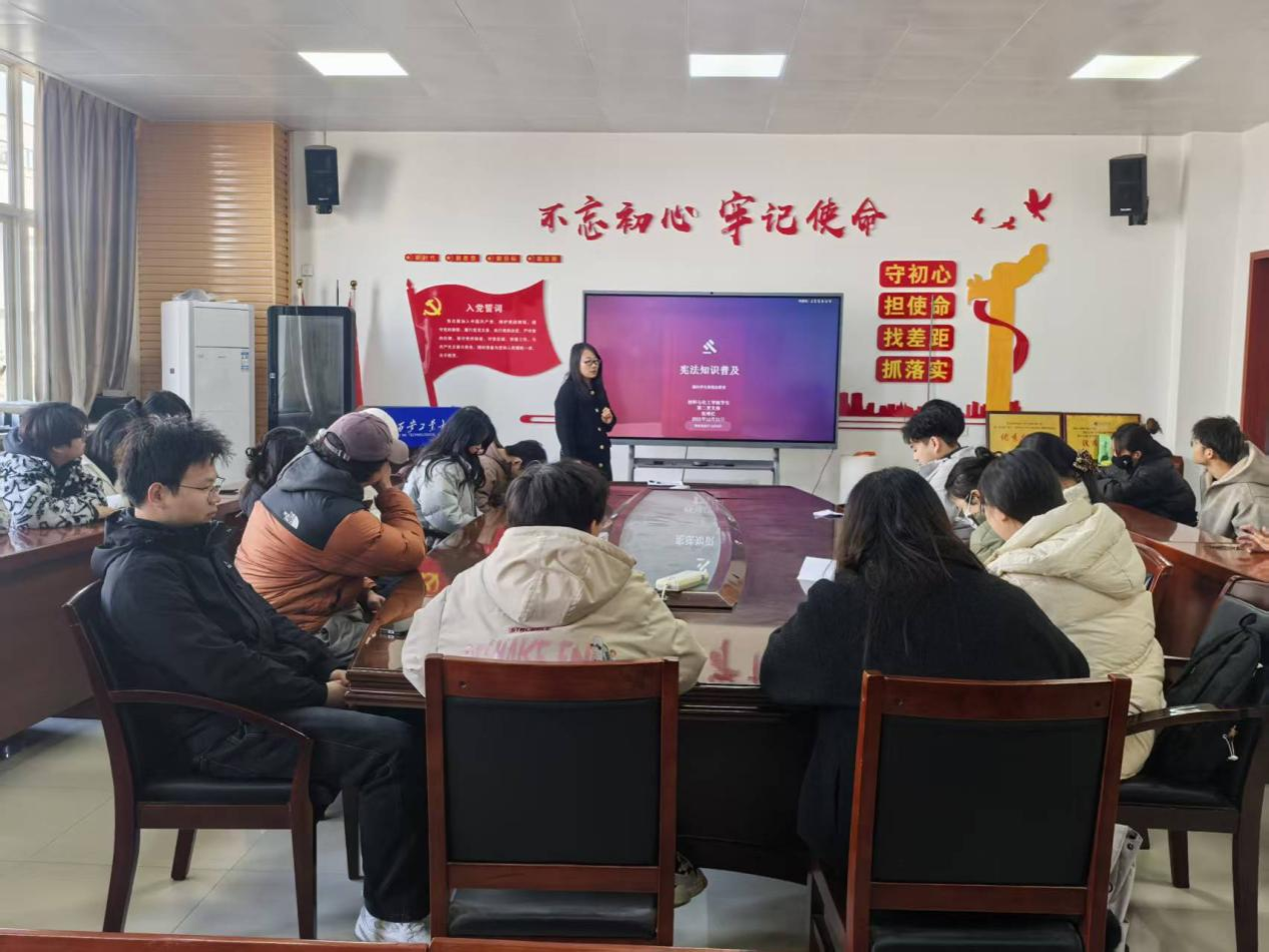 为深入学习宣传宪法知识,弘扬宪法精神,增强支部成员的法治观念和法治素养,12月26日,太阳成集团tyc1286学生第二党支部在工3-410召开宪法知识普及学习会,会议由支部书记张瑞红主持,支部全体成员参加。
