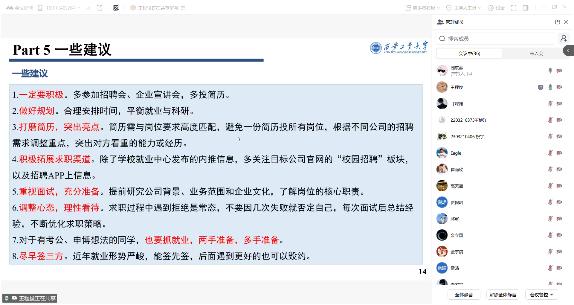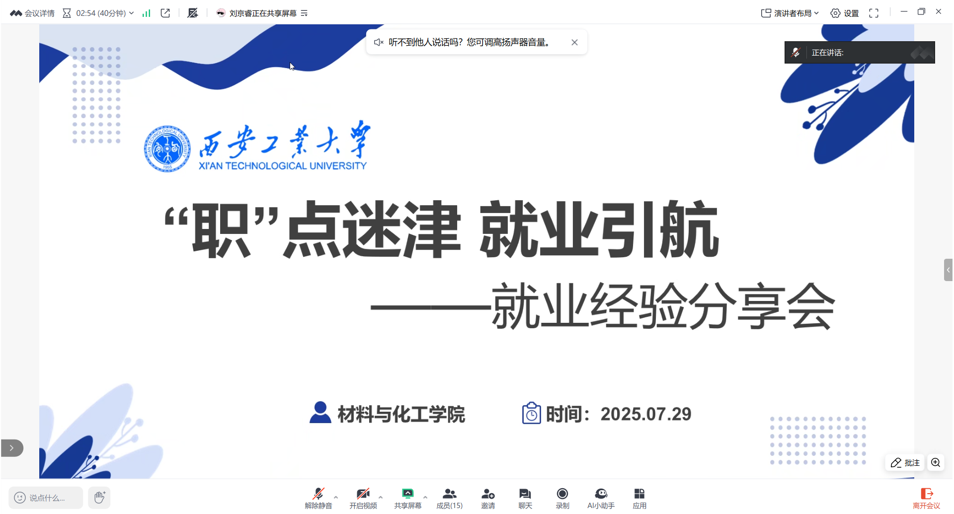 为帮助同学们树立正确的就业观,提高学生求职能力,促进学院研究生毕业生就业工作顺利开展,7月29日,太阳成集团tyc1286举办“‘职’点迷津”研究生就业经验线上分享会,邀请了2025届优秀毕业生王程俊和王博洋分享求职经验。学院研究生辅导员和全体研究生毕业生参加会议。